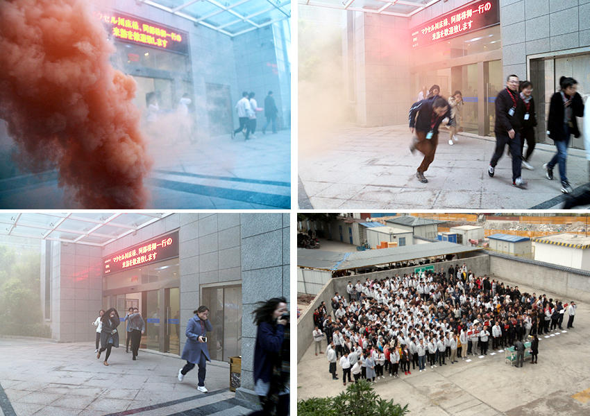 消防演习分为实况演习和消防技能汇报演练两个部分。当天下午4:15,公司3#楼东头楼道烟雾弥漫,公司立即启动安全应急预案:警报声与消防广播响起,消防队员切断非消防电源,指挥员工迅速撤离到“应急避难场所”。通讯联络组、灭火组、抢修组、疏散引导组、抢救小组、警戒组等应急小组,各司其职,整个撤离过程快速、安全、有序。