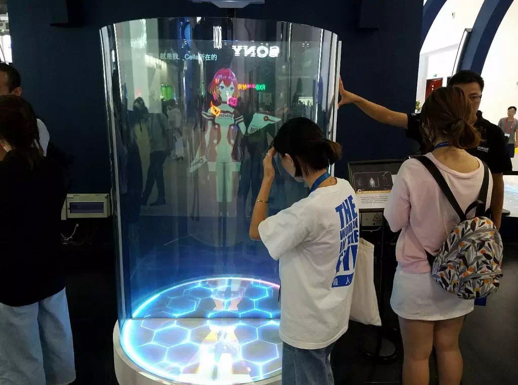 此展区以模拟仿真投影为灵感,在透明柱形空间中对半透明玻璃进行投影,从而获得影像悬浮于空中的全息般视觉效果。其中,投影屏幕采用了麦克赛尔研发的业内领先的具备隔热保温功能的半透明屏幕膜,兼具实用性和美观度。二次元人物的可爱造型和虚幻漂浮的效果,让展区前的观众不时举起手机拍摄。