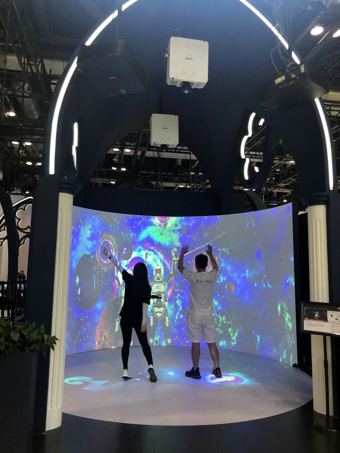 此展区以投影机的镜头为灵感设计了拱形入口,正面采用4台投影机投影圆型影像,地面采用2台投影机并结合使用交互传感,让观众能够在走动中感受与影像的互动。现场有观众跃上舞台,一边走动一边用手机拍摄自己步伐激起的涟漪,趣味横生。